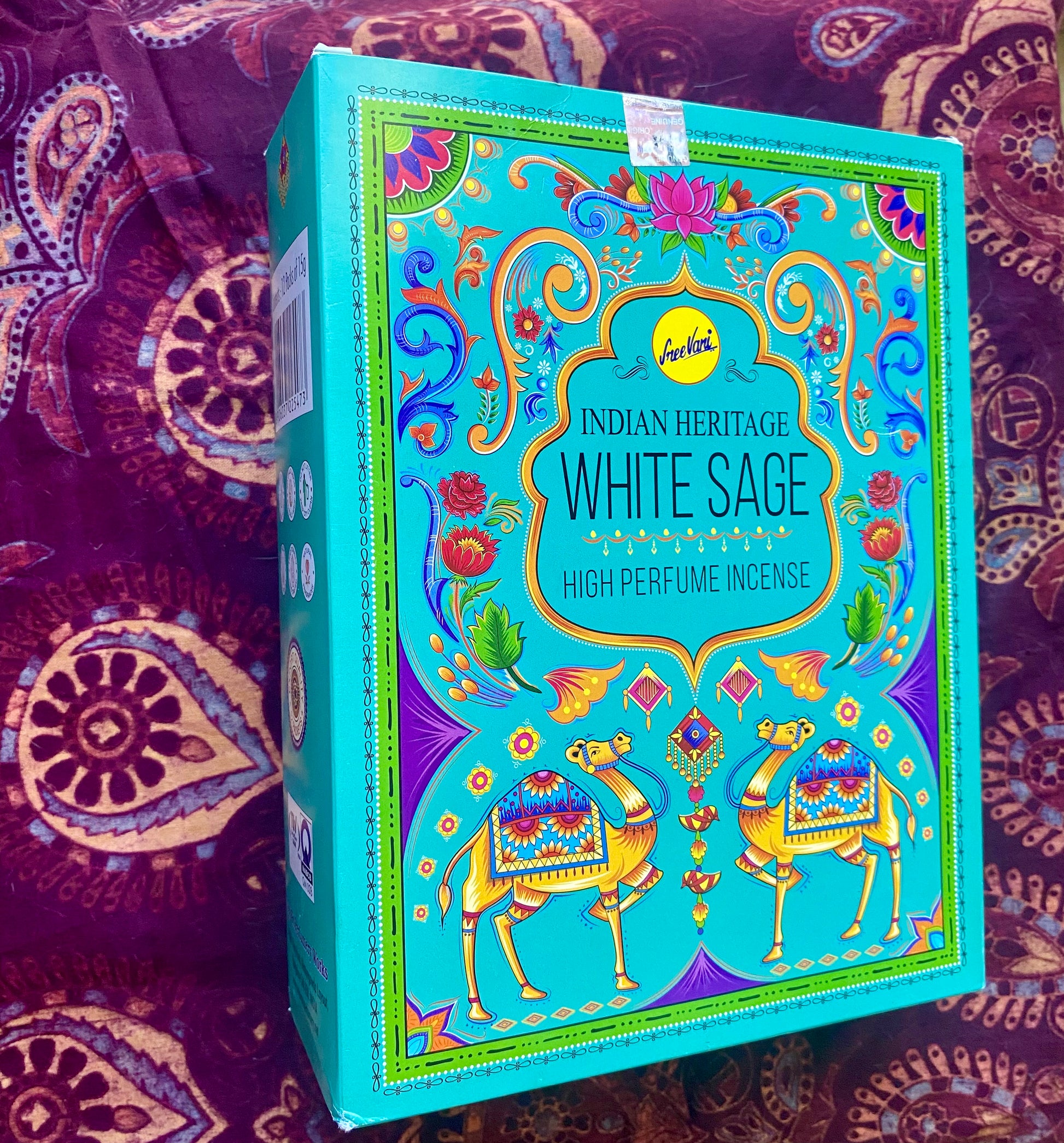 Incienso Sree Vani White Sage, con el poder purificador de la salvia blanca y un precioso diseño en cada caja.